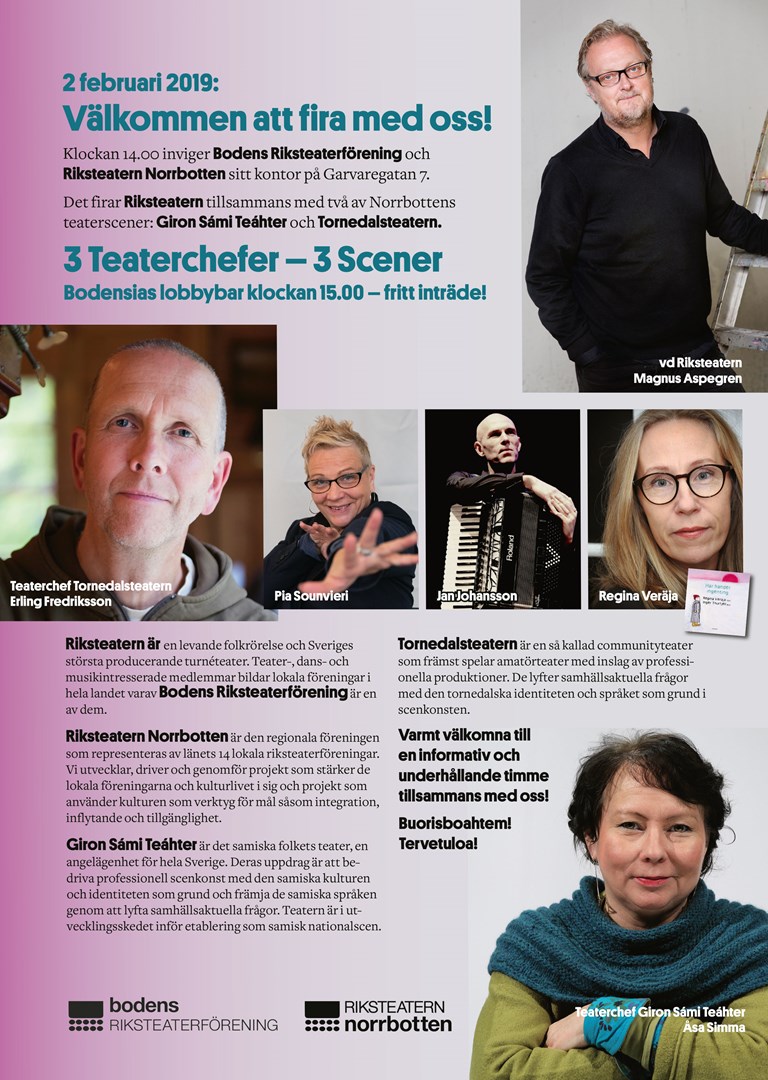Kommunalråd Claes Nordmark & Kulturchefen på Region Norrbotten, Kristina Nilsson tillsammans med ordförande för Riksteatern Norrbotten, Kristina Grubbström & Ordförande för Bodens Riksteaterförening Lotta Styvén inviger vårt nya gemensamma kontor på Garvaregatan 7. Det sker utomhus & det finns möjlighet att gå upp & kika på lokalen. (Tre trappor ej hiss)
