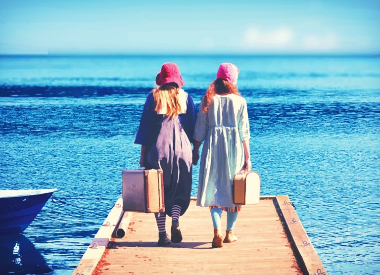 På sin vandring till havet stannar de en stund och delar med sig av sina visor och historier. Två vandrare i färgglada dräkter dyker upp. De har kommit på visit till barnen. Deras berättelser blandas med sånger och rörelser och dans. Både barn och vuxna får vara med, men bara om man vill. De båda vännerna, Lova och Viktoria, är på väg till havet och vi möter både hajar och bläckfiskar i vågorna. Med sig har de en väska, i den finns nästan allt! Barnen kan känna igen sig i snälla bus, att sura en stund och att bli sams med bästisen igen. Musiken är specialskriven till föreställningeni.