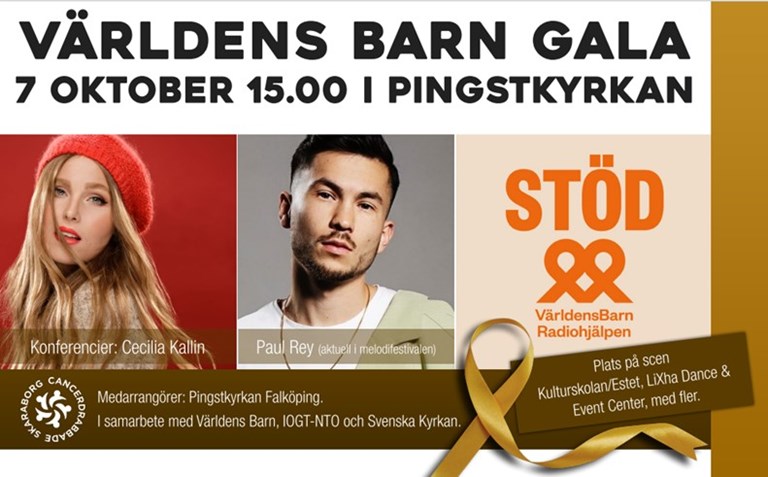Världens Barn Gala med insamling för Världens Barn En eftermiddag där Cecilia Kallin leder oss i en konsert, där hon själv kommer att uppträda. Paul Rey, en av finalisterna i årets melodifestival, kommer speciellt till Falköping för att förgylla oss i publiken. Esteter/Kulturskolan, LiXha Dance & Event Center och andra lokala förmågor kommer även att dyka upp på scen. Lotteri och andra andra överraskningar väntar oss som besökare. Alla biljettintäkter går till Världens Barn. OBS! Scenpass gäller ej!